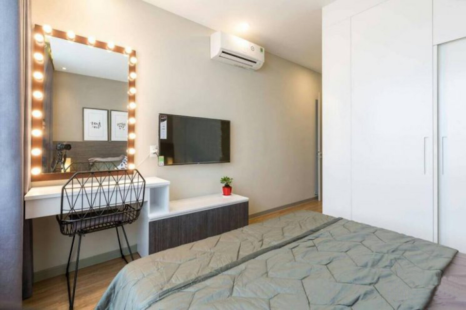 Giường, Cửa sổ, Đèn ngủ, Tủ âm tường, Bếp gas âm, Bếp từ âm, Tủ bếp, Máy rửa bát, Bàn ăn, Máy hút mùi, Vách kính nhà tắm, Vòi, hoa sen, Toilet, Quạt thông gió, Bồn rửa mặt, Rèm, Tủ giầy, Đèn ốp trần phòng khách, Đèn ốp trần nhà tắm, Chắn ban công, Cửa, nhôm kính, Đèn ốp trần ban công.